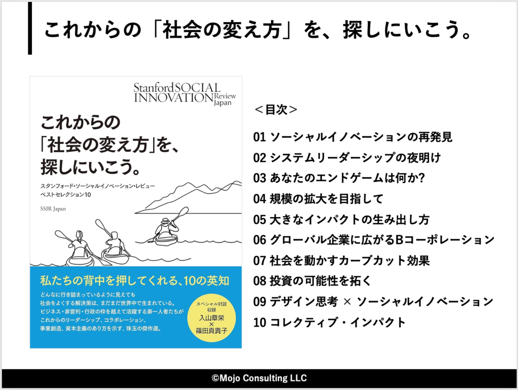 自分が受け持つのは冒頭の4回だけですが、教材のStanford Social Innovation Reviewの『これからの「社会の変え方」を、探しにいこう。』を読み、ソーシャル・イノベーションの理論的な基礎を学んでいきます。初回は自分からソーシャル・イノベーションとは何かについてお話し、ちょうど2回目が終わったところ。全4回で10本の論文を担当に割り振って読んでいきます。