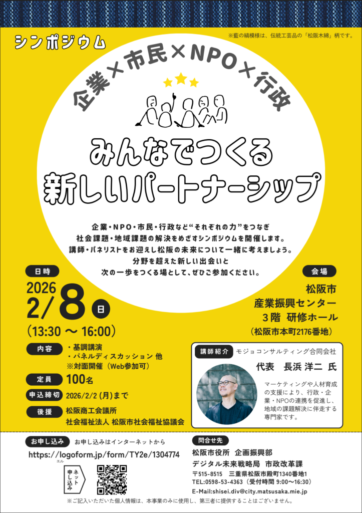 2026年2月8日(水)、松阪市が主催する企業x市民xNPOx行政によるシンポジウム、『みんなでつくる新しいパートナーシップ 』で代表)長浜が講師を務めます。