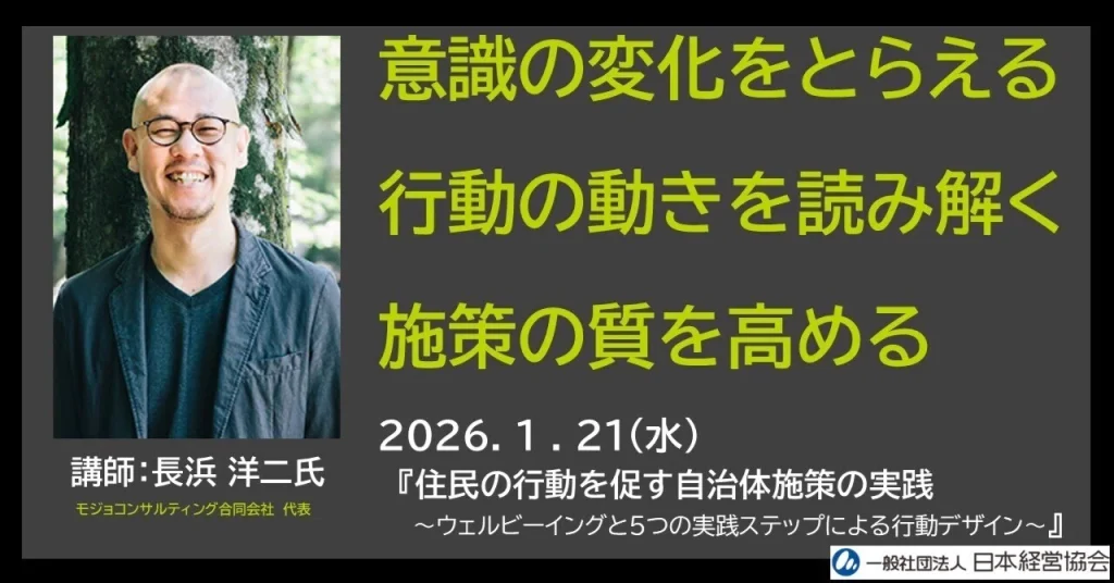 2026年1月21日(水)、一般社団法人日本経営協会が主催する行政管理講座、『住民の行動を促す自治体施策の実践 〜ウェルビーイングと5つの実践ステップによる行動デザイン〜』で代表)長浜が講師を務めます。