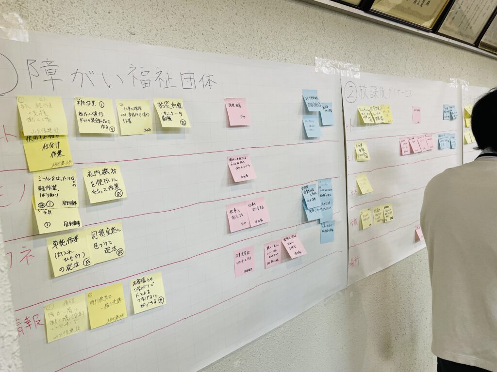 その上で、障がい福祉放課後デイサービス環境保全フードバンク自治会の5テーマを設定し、具体的な困りごとを全体で共有しながら、どのようなサポートが出来るのかを洗い出していきました。当たり前ではありますが、企業の事業内容により提供できることは多種多様。地域活動団体の抱える組織課題とどのようにマッチングさせ、その先で地域課題を解決していくのかが知恵の働かせどころでああり、腕の見せどころでもあります。年を跨いて、出されたアイデアを実行に落とし込むべく、整理を進めていきます。