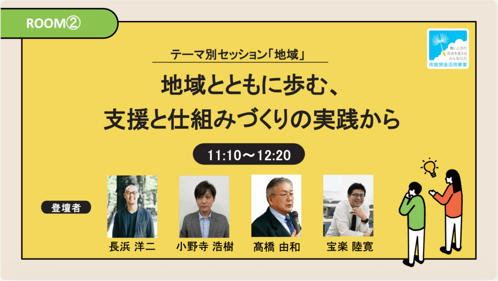 今年は、テーマ別セッション「地域とともに歩む、支援と仕組みづくりの実践から」でモデレーターを務めました。地域で活動する中間支援組織やPOにとって、「地域をつくる」とはどのような営みなのか、地域とどのように関わるのか、自組織のビジョンと地域との接続をどう描くかを見つめ直し、POとしての役割や自組織の方向性を振り返る機会とすることが狙いです。御登壇いただいたのは、市民活動の中間支援組織である、いちのせき市民活動センター)小野寺浩樹さん、全世帯加入型NPOのきらりよしじまネットワーク)高橋由和さん、都市部のコミュニティ財団である、泉北のまちと暮らしを考える財団)宝楽陸寛さんのお三方です。「なぜ、この人が、この場に?」という顔ぶれですね。