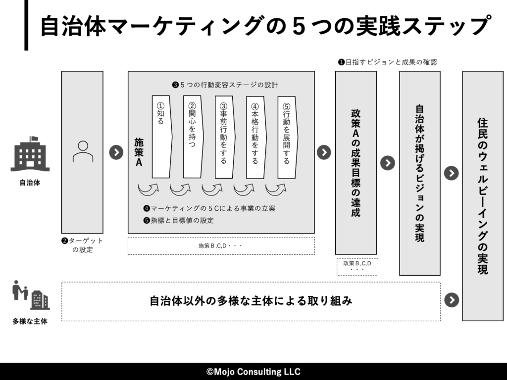 「なぜ公務員がマーケティングを学ぶ必要があるのか?」という問いは、多くの公務員の皆さんが持つものです。企業のように利益や売り上げの拡大が自治体の存在意義でもゴールでもありませんが、消費者が製品やサービスを購入・利用するに至るまでの一連の行動プロセス(企業にとってのゴール)は、地域内外の住民の行動変容を促し、自治体の掲げる様々な分野における政策の成果を創出するという点においてもそのまま応用・実践できることです。マーケティングという眼鏡を通して、地域内外の住⺠・事業者のニーズや価値を整理し、政策の成果創出に向けた視点を得られたことと思います。