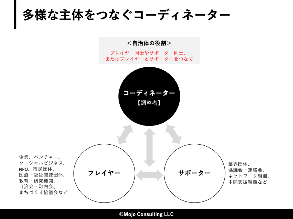 最後の第3部では、「公務員に求められるコーディネーション・スキルを学ぶ」をテーマに、組織内外の関係者をつなぎ、話し合いの場を整え、対話を通じて合意形成を促すためのコミュニケーションやファシリテーションの基本技法を学んでいただきました。VUCA(Volatility[変動性]、Uncertainty[不確実性]、Complexity[複雑性]、Ambiguity[曖昧性])の時代と呼ばれる現在において、マンパワーや財源不足という課題を抱える自治体だけで複雑化・相互依存化した地域や社会の課題解決を行うことは至難の業。そこには地域内外の多様な主体との協働や連携が不可欠です。政策・施策・事業づくりからその実践に至るまでの一連の流れにおいて、今後、公務員は「コーディネーター」としての役割が求められます。